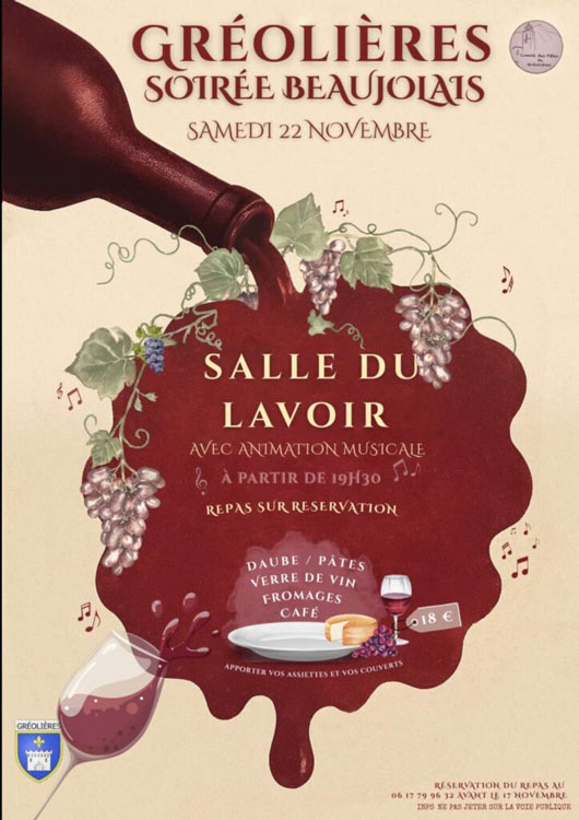 Le22nov.de19h30 à 23h00LieuSalle du lavoir - GréolièresGréolièresLOISIRSSoirée Beaujolais à GréolièresAjouter à mon calendrierAvec animation musicaleRepas sur réservation : Daube / pâtes - Verre de vin - Fromages - CaféTél. 06.17.79.96.32Sélection de la vue© OpenStreetMap contributorsFermerPrécédentRetour à la listeSuivant